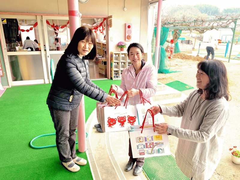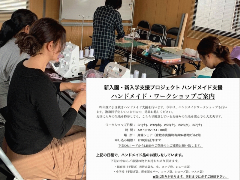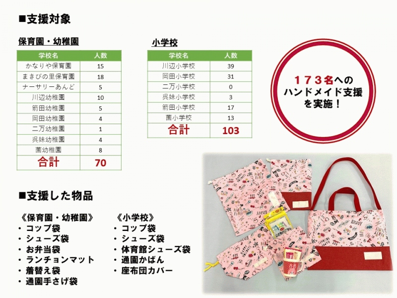 真備市内9つの保育園・幼稚園と、6つの小学校に入園・入学する子ども合計173名にハンドメイドの支援を実施することができました!