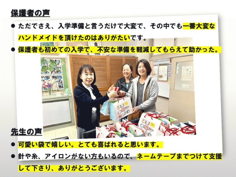 昨年度、ハンドメイド支援品を各学校園・保護者にお届けした際、たくさんの方から喜びのメッセージをいただくことができました!
